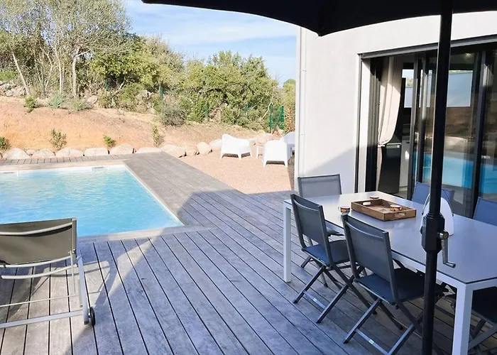 Nestled 10 minutes by car from Plage de Vardiola, the 2-bedroom Villa Copains, 5 Pers, Piscine Chauffee, 5 Mn Plage entices guests to explore various tourist destinations nearby.